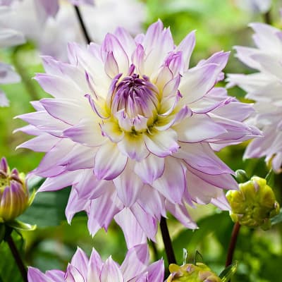 Рассада георгины декоративной Крейзи Лав (Dahlia decor Crazy Love) в середине июля расцветает крупными белыми цветами со светло-сиреневыми лепестками и яркой, четкой сиреневой окантовкой по краям лепестка. Высота растения 90-100 см, период цветения заканчивается в октябре. Для максимального комфорта требуется хороший дренаж почвы, обилие питательных веществ и воды, солнечное место, защищенное от сквозняков. Растение однолетнее, привлекательно выглядит в монопосадках в открытом грунте, смешанных композициях и срезанных букетах. Не имеет аромата и требований к соседству.