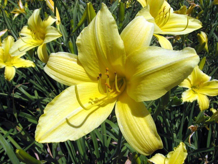 Саженцы Лилейника Гибридного Еллоу (Yellow Hemerocallis) очень популярны среди дачников – цветок неприхотлив, не требует регулярного ухода и каждый год обеспечивает буйное цветение ярко-желтых бутонов на протяжении июля-августа. Куст пышный, быстро разрастается, занимает собой достаточно большое пространство сада, прекрасно соседствует с другими садовыми культурами. Yellow Hemerocallis отлично себя чувствует на открытых, светлых участках. При этом сам может обеспечить затенение другим культурам, которым противопоказаны прямые солнечные лучи.
