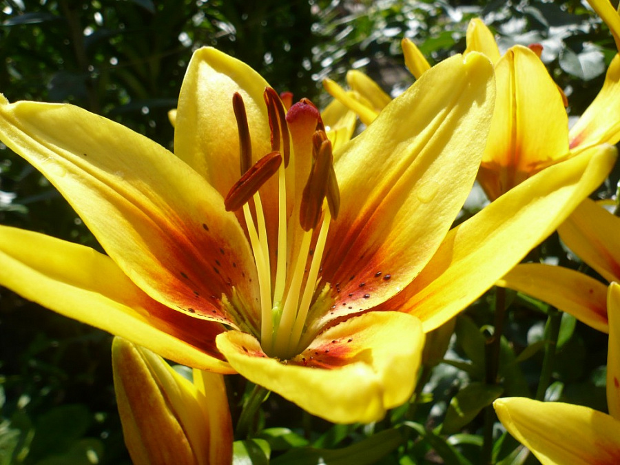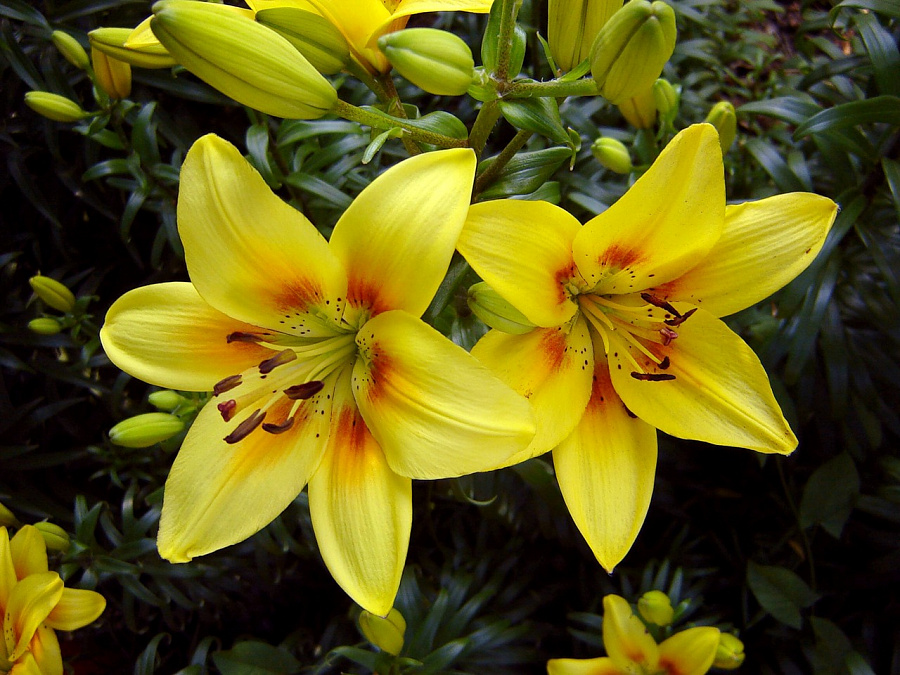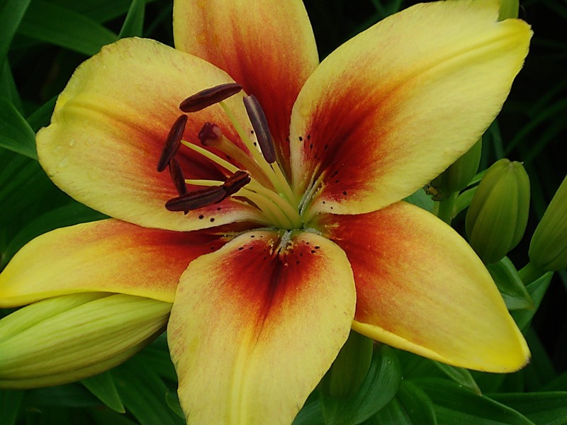 Окраска цветка : желтые, с красно-коричневым основанием и пыльниками
