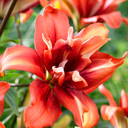 Луковицы лилии Cocktail Twins используются для создания одиночных и групповых посадок на фоне газона, ярких пятен в смешанных цветниках. Цветет растение с конца июня до августа крупными соцветиями. Диаметр махровых цветков 15 – 18 см. Главное отличие сорта – бутоны не имеют запаха. Но это компенсируется эффектным окрасом. Лепестки лилии Cocktail Twins красные, с небольшими желтыми мазками по центру. Высаживать культуры рекомендуют на солнечных или частично освещенных участках в рыхлую почву. В уходе растение неприхотливо.