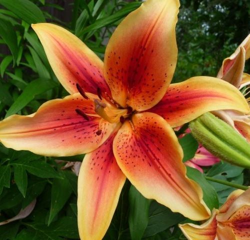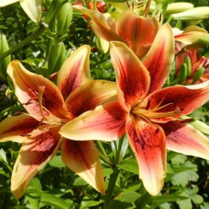 Высота растения 110 см. Оранжево-красные цветки с бордовым крапом приобретают наиболее яркую и нарядную расцветку на солнечных участках. Они хорошо стоят в срезке и обладают приятным ароматом. Цветет этот сорт в июле-августе. Выращивание оа-гибрида не доставит особых хлопот. Важно учесть, что растения не любят излишней влажности.