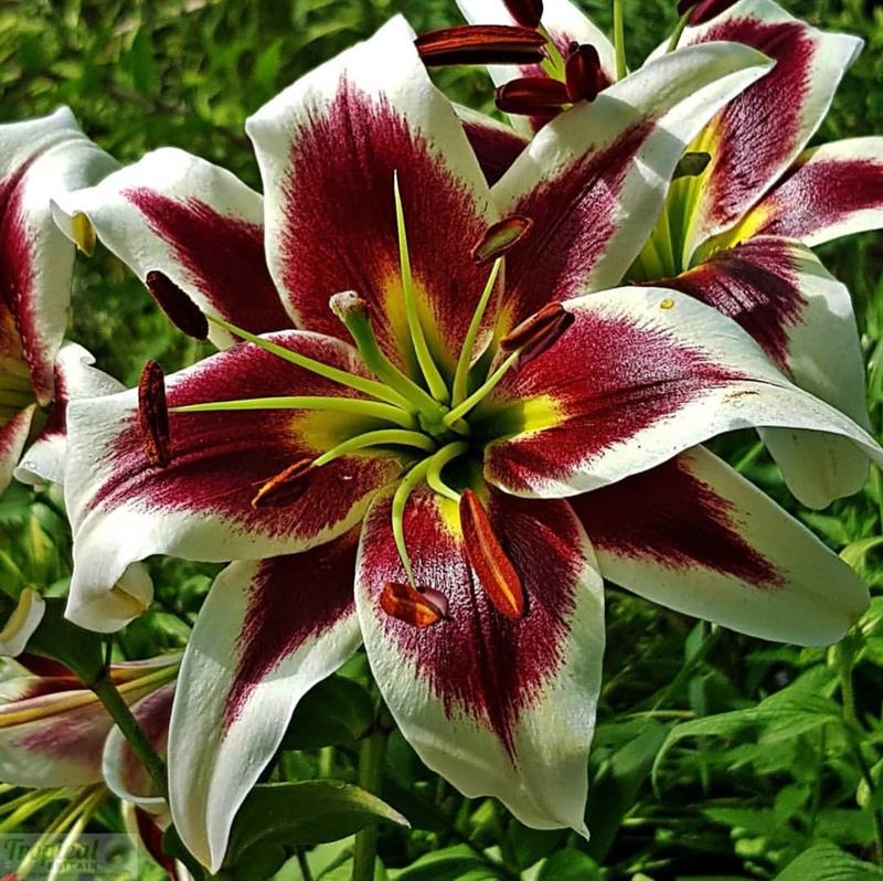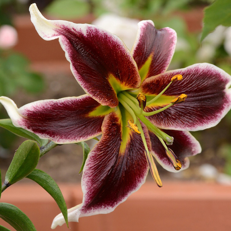 Окраска цветка : насыщенный, винный с белой каймой и зеленовато-желтой звездочкой в центре