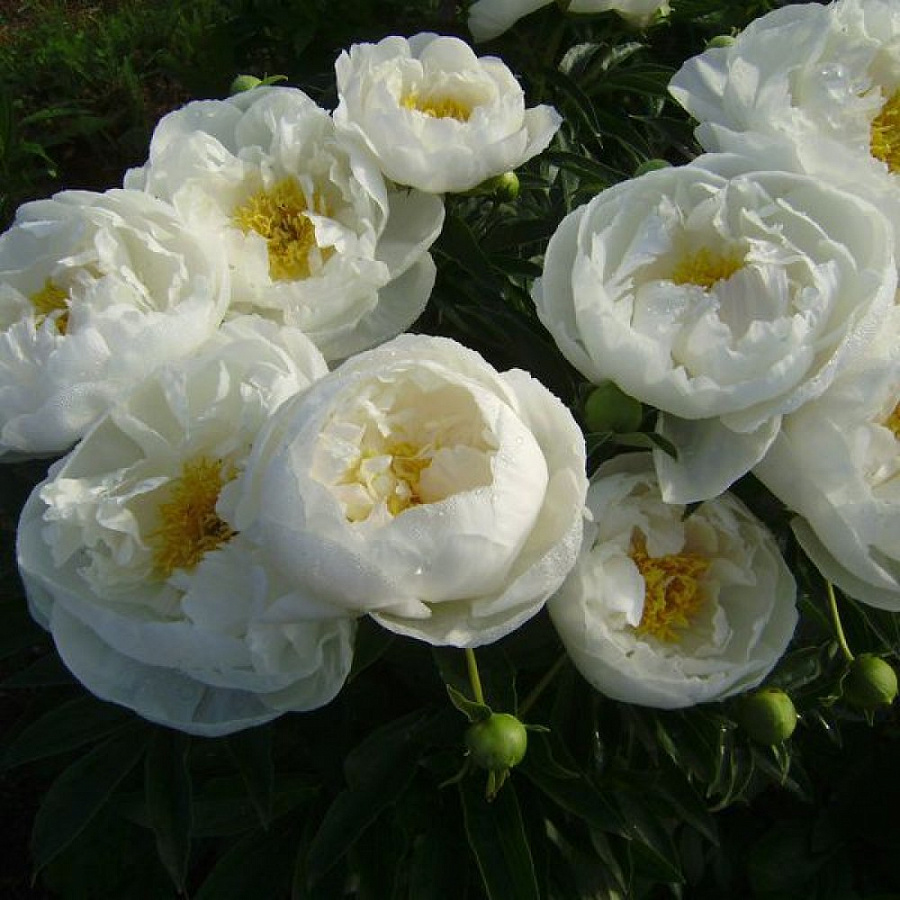 Луковицы пиона для патио Мадрид относятся к травянистым молочноцветковым гибридам, выведенным в США. Растение станет роскошным украшением сада, террасы или даже балкона. Его небольшие размеры (в высоту взрослый куст не превышает 30 сантиметров) позволяют выращивать пион даже в кашпо в комнатных условиях. Мадрид характеризуется заостренными листьями и полумахровыми белоснежными цветами с крупными лепестками, расположенными в два ряда. Центр цветка украшают золотистые тычинки. Достойную компанию пиону могут составить другие виды из сортовой серии пионов для патио.