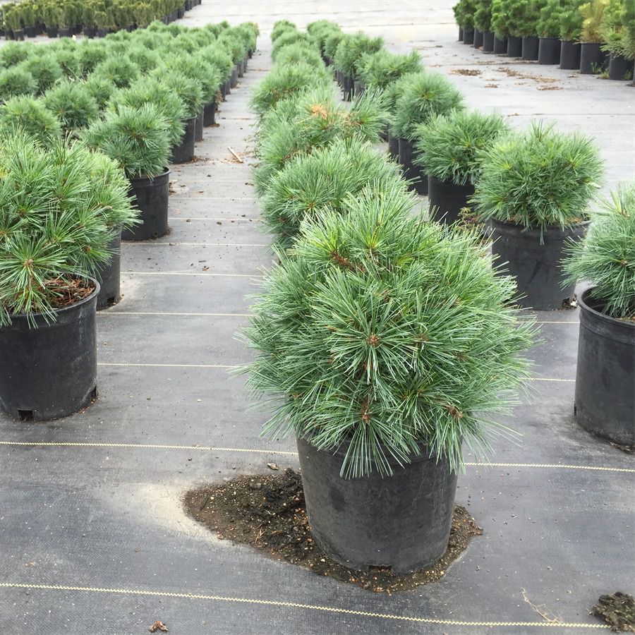 Саженцы сосны Веймутова Блю Шег (Blue Shag): декоративные шаровидные кроны карликового кустарника прямо светятся серебристо-зеленой хвоей. Габариты взрослого крупномера - до 1,5 м ширины и до 1,2 м высоты. Компактность сосны Веймутова Блю Шег позволяет использовать сорт в любых ландшафтных комбинациях. Хвоя очень длинная и мягкая, с синеватым отливом, растет пучками по 5 штук. Шишки длинные, конической формы, бледно-бурого оттенка. Достоинства: