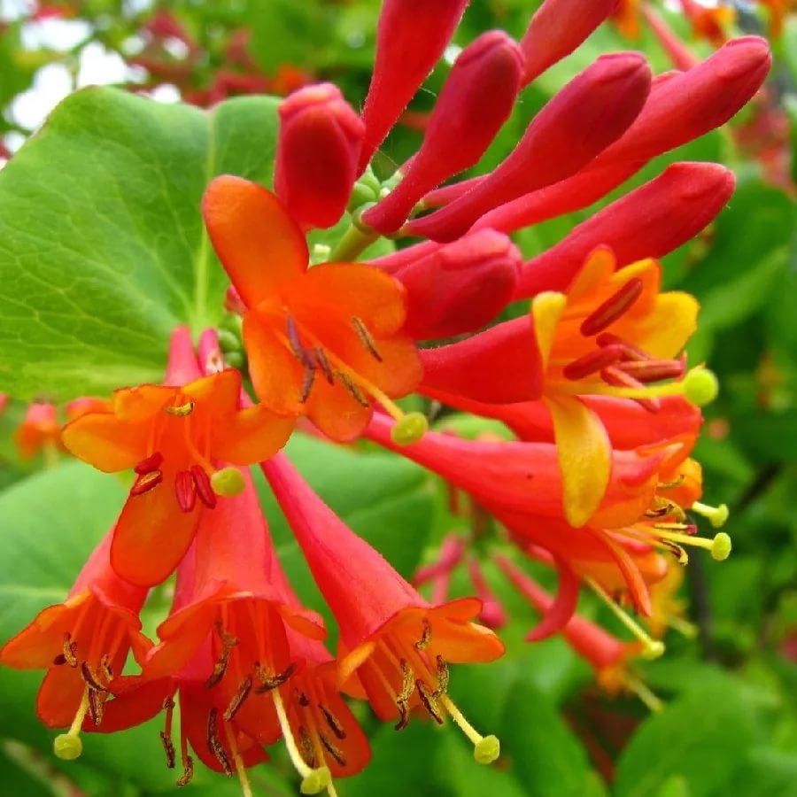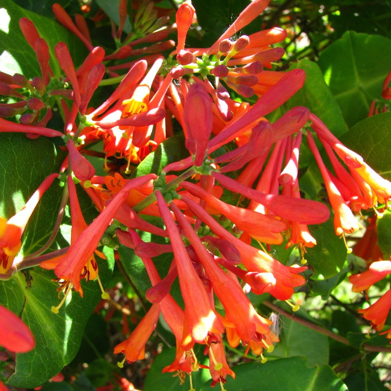 Саженцы жимолости Дропморе Скарлет (Dropmore Scarlet) вырастают слабовьющим кустиком около 2-3 м в высоту. Листва эллиптической формы, темно-зеленого тона, располагается супротивно друг другу. Верхние листочки имеют округлую форму и сросшиеся между собой вокруг стебля. Цветет трубчатыми цветочками ярко-оранжевого окраса с длинными тычинками в середине. Цветение собрано в небольшие пучки. Плюсы жимолости Дропморе Скарлет: - интересное цветение - высокая декоративность - нужен несложный уход Плоды ярко-красного цвета, округлой формы собраны в щитовидную форму. Несъедобные, но очень колоритно смотрятся.